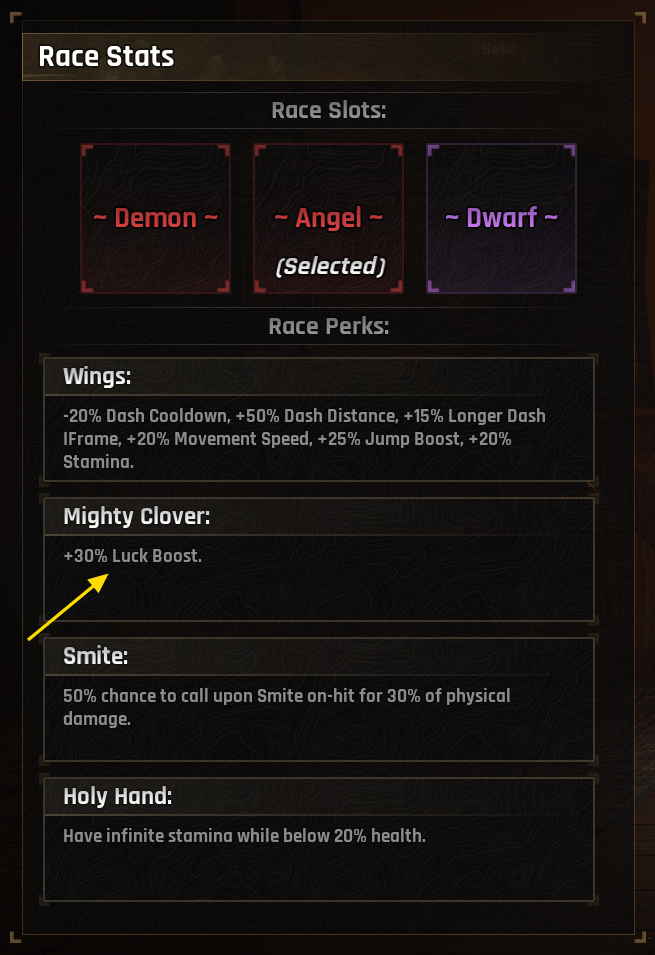 Angel is the movement king. It boosts dash distance, dash cooldown, stamina, jump height, and movement speed. When your HP is low, you basically get infinite stamina. Angel also gives a massive luck boost, which helps with rare drops. Here are its stats: