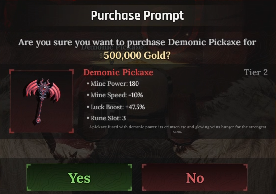 After purchasing, the Demonic Pickaxe is permanently yours.
