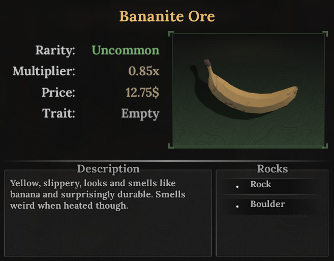 Bananite drops from rocks in the starter island caves(Iron alley).