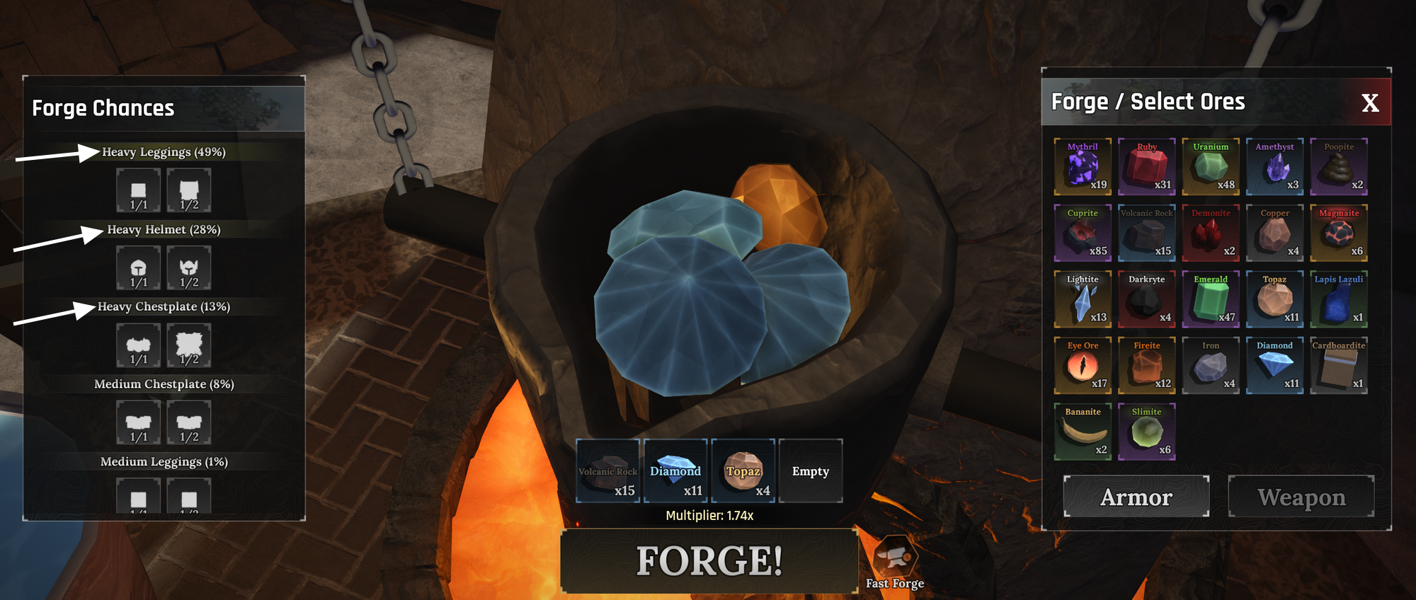 Your goal is to force the forge into giving you Heavy Chestplate, Heavy leggings or heavy helmet because they sell for a lot.