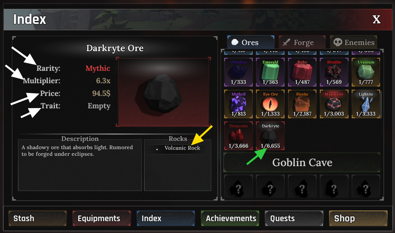 This page lists all known ores, their drop chances, rarities, multipliers, traits, and where they can be found.